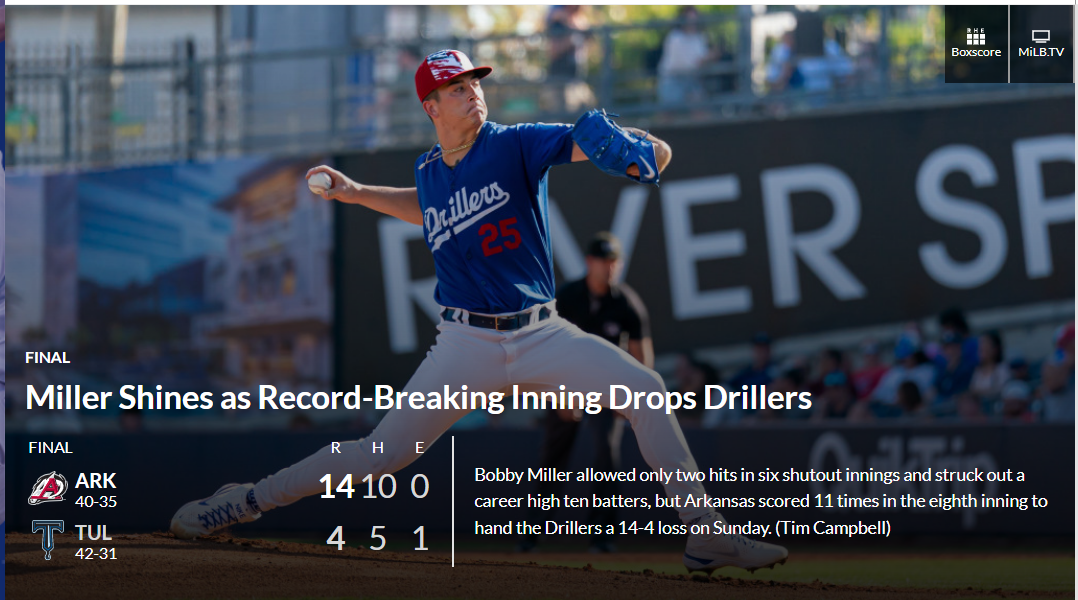 The Driller bats were silent until the eighth inning when they were able to push four runs across. Leonel Valera led off with a walk followed by Jeren Kendall who was hit by a pitch. Ryan Ward drove in the first Tulsa run with a single and Andy Pages followed him with a three-run home run to left field.