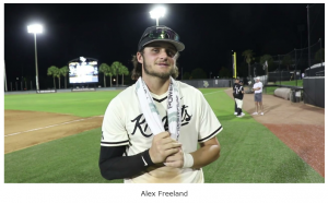 The player of the game is Alex Freeland who had two hits, two runs scored, one RBI with his home run turning out to be the winning run.