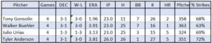 Notice that Andrew Heaney and Blake Treinen are not included in the above chart. Both hit the IL before this stretch started. Treinen is now on the 60 day IL. He is not expected back before the All Star break. Neither Heaney nor Kershaw are expected back before this stretch is complete.