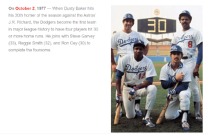 Manny Mota was activated late in the year and hit .395 in 38 at bats at the age of 39. He and Glenn Burke, hit their only homers of the year on the last day of the season, the same day Baker hit #30.