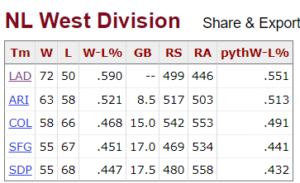 On August 5, 2017, after 50 games in which the Dodgers went 43-17, they were comfortably in 1st place in the NL West.