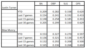 So if the Dodgers are going to go on one of those runs, JT and Max are going to need to begin hitting, or the Dodgers are going to need to find suitable replacements. What are the odds? Let’s look at 2022 recent hitting trends.