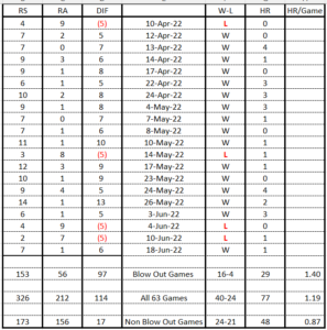 In MLB parlor, a blowout game is one where the game run differential is 5 runs or more. The Dodgers are 16-4 in those contests, with a run differential of +97 in those 20 games. In the other 45 games, the team is 24-21 with a run differential of +17.