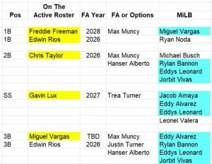 Infielders will be in flux. There is one for sure free agent (Trea Turner) and two veterans with team options (Justin Turner and Max Muncy). Questions: