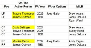 The outfield is a little more precarious, but the rise of Trayce Thompson does alleviate some of the pressure. Per FanGraphs fWAR for Cody Bellinger, unless he gets hot, he is not going to get enough fWAR to earn his $17MM contract. But he will be close enough that there is virtually no chance he will be non-tendered. With Trayce Thompson, Cody Bellinger, and Mookie Betts, the outfield should be solid. James Outman has earned a shot at the 4th OF position. I like the idea of Joey Gallo’s monstrous power in the lineup, but with Outman a LH OF is there a need for Gallo. I would rather have JT or Max in lieu of Gallo.