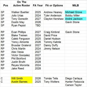That is a very thin set of starting pitchers. I have to believe that AF/BG is going to try and sign two of the three of Clayton Kershaw, Tyler Anderson, and Andrew Heaney. Kershaw could retire (especially if LAD wins the WS). There are other pitchers that AF/BG might look at, but he knows what he has with Anderson and Heaney. One intriguing pitcher that might opt out of his current NYM deal and explore a Max Scherzer type contract is Jacob de Grom. I think AF/BG has to look at him.