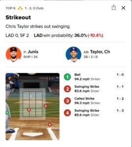 I know we are not supposed to question Dave Roberts’ in-game managerial decisions, but here goes anyway. Down only 2-0 in the top of the 6th, JD Martinez and Trayce Thompson singled, and Miguel Vargas reached on catcher’s interference to load the bases with nobody out. Doc had a decision…send up the pressing CT3 to hit against Jakob Junis or send super-confident giant killer Max Muncy to face Scott Alexander. Roberts chose the former option, and that led to second guessing even from him.