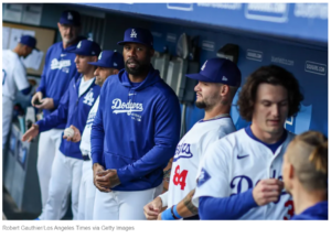 It looks like Jason Heyward is looking over at James Outman knowing what he is reading is a ticket to OKC, and Andy Pages is standing back and thinking…”Leave me out of this”.