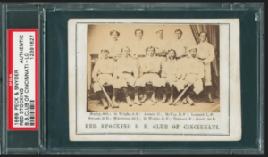 The front of the card had a photo of the respective team and a cartoon image representing the store in New York. The 1869 set featured the first professional team, the Cincinnati Red Stockings and came in two different sizes.