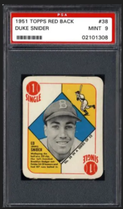 A company called Topps entered the scene in 1951. Their first foray into the business was their red and blue back cards in 1951. They were made to look like playing cards and featured a player’s photo and a baseball play on the front.