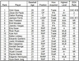 11 of the top 21 prospects per Baseball Prospectus remained on the 2025 list. Two others were top prospects with the Cubs (Jackson Ferris #11 and Zyhir Hope #16). Seven of the 2025 top prospects were new.