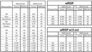 Below I have included offensive and pitching comps of 2025 to date and 2024.  After 20 games, do they mean anything, really?  Make of them what you will.  For me, it does seem to indicate how dependent they are on the HR thus far. I will periodically update these throughout the year.