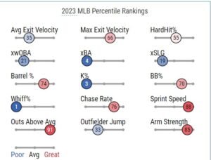 - Expected On Base (21st percentile), Batting Average (4th percentile), and SLG (19th percentile)