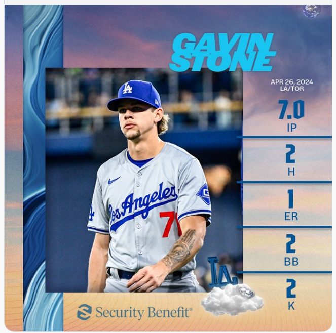This was Gavin Stone’s best game of his career. He gave up a single to JT in the 2nd, 2 walks in the 3rd coming back after a long 6 run 3rd for the Dodgers, and HR to Danny Jansen on his worst pitch of the game. It was middle/middle and had a big neon sign saying Hit Me, and Jansen did. After that HR, Stone retired the next 10 Blue Jays, including his 2 Ks (Bo Bichette and JT). Stone had 94 pitches, an average of 13.4 pitches per inning.