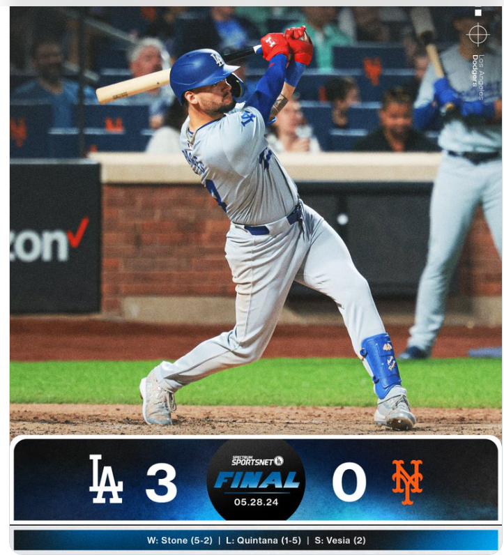 Stone gave way to Alex Vesia in the 8th.  He proceeded to shut down the Mets with no hits and 1 walk.  He struck out Brandon Nimmo and DJ Stewart to end the game.
