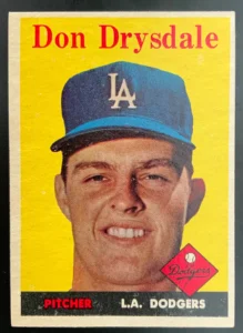 The 1958 Dodgers finished in 7th place. Drysdale had a 12-13 record with an ERA of 4.17. He led the league in hit batsmen with 14. The first of four years in a row leading the league in that category. Don got the opening day start at Seals Stadium in San Francisco and gave up six runs in 3.2 innings. He did not get his first win until May 6th, a 7-6 walk off win against the Phillies at the coliseum. He would go 11-8 the rest of the season. The 1958 Dodgers were the first Dodger team to finish below .500 since 1938.