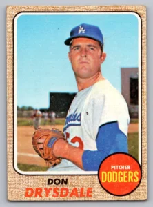 1968 wasn’t much better. The team finished 7th this time. Drysdale led the staff with 14 wins, this time he was the only starter above .500 with his 14-12 record. Among his 14 wins were 8 shutouts, including 6 in a row. He pitched a record 58.2 consecutive scoreless innings. That record would stand until Orel Hershiser passed it with 59 scoreless innings in 1988, 20 years later, and when he did it, Big D was in the booth. 1968 would be Drysdales last hurrah.