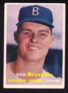 Brooklyn once again thought highly of his skills, and he went to camp with the big club for the 1956 season. A couple of things happened that probably contributed to Drysdale being promoted. One was the Dodgers lost Podres to military service in the Navy. Billy Loes, Karl Spooner and Don Bessent all got hurt. So, Brooklyn kept the 20-year-old Drysdale on the roster. He made his MLB debut on April 17th, pitching a scoreless 9th inning in a loss to the Phillies. He made his first start on the 23rd of April, also against the Phillies. He struck out 9 and allowed just one run in a complete game win. He would finish 1956 with a 5-5 record and a 2.64 ERA. He struck out 55 and walked 31 in 99 innings of work. Drysdale pitched in one game in the World Series. He allowed a 2-run homer to Hank Bauer in game 4, a 6-2 loss for Brooklyn. In 1957, he was promoted to the starting staff.