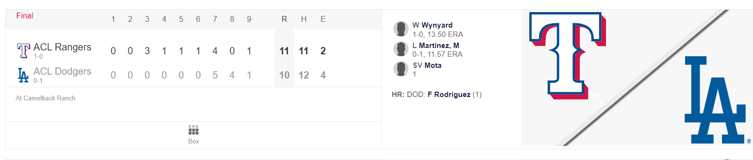 The ACL Dodgers opened the ACL season against the ACL Rangers. Final score ACL Rangers 11 vs ACL Dodgers 10.