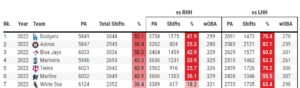 No team shifted more than the Dodgers. Three teams shifted at least 50%, while another 3 shifted 40% to 50%. That is 26% of the teams that shifted less than 40%. The top 7 teams that utilized the shift most during 2022.