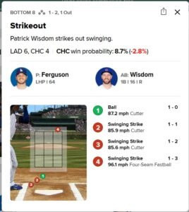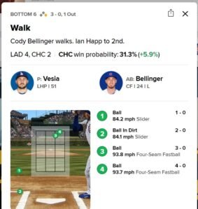 First off, I have been hard on Alex Vesia this season, so when he does well, I have to give him credit. Not only did he have to face the Cubs batters, but he had to battle the umpire as well. Check out Ball 3 and Ball 4 below.