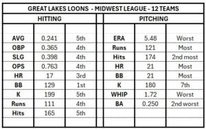The Loons have one player that is in the league top echelon: Zyhir Hope. Hope is slashing .310/.383/.560/.943. Hope is 6th in BA, 8th in SLG, and 10th in OPS.
