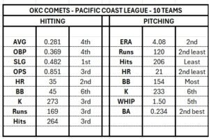 OKC is in 1st place in the Pacific Coast League East Division with a 19-8 record. That also happens to be the best record in all of the PCL. The Comets are 5.0 games ahead of Round Rock (Texas) in the PCL East.