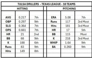 Pitching wise, Tulsa also has 1 qualified pitcher…Jerming Rosario with 17.1 pitches. However, Jerming is not in the top 15 in ERA, WHIP, or BAA.