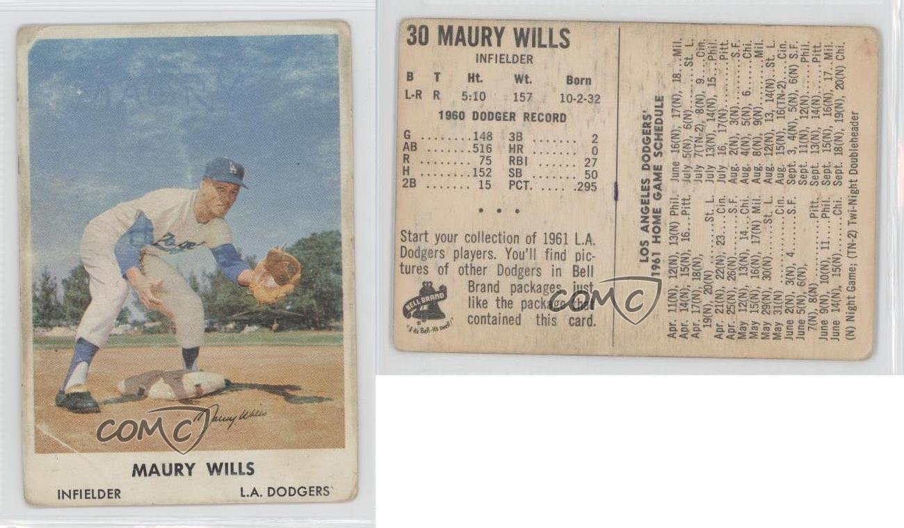It is something of note that Topps did not make a Maury Wills baseball card during his first tenure with the Dodgers. K-Mart got permission to use the 62 cards border and made these 1972 cards of Wills that were never issued, To get a card of him as a Dodger back then, you would get one from post cereal or the Bell Brand Potato chip cards they made in 61 and 62, There was a photo of Wills making a play in the 1960 World Series cards issued by Topps. His first Topps card is the 1967 Pirates. He did have a 1963 Fleer. His first Topps Dodger card was made in 1972.