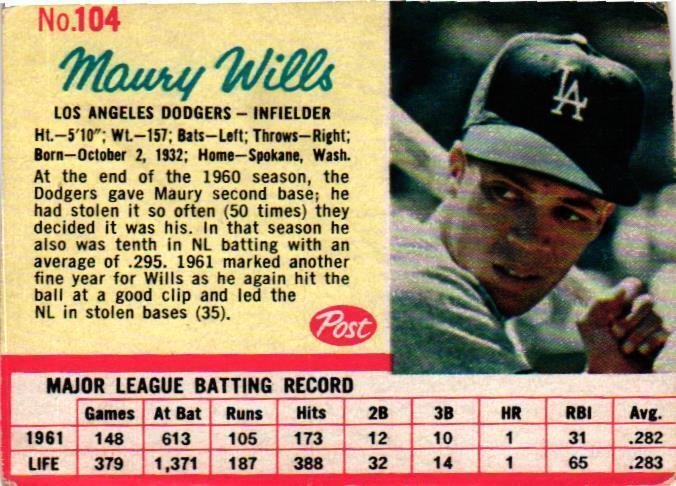 Wills had another good season in 61, his BA dropped a little to .282. But he was named to both All-Star squads, MLB played two All-Star games in 61 and 62. He also hit his first career homer. He earned his first Gold Glove, even though he had 29 errors. And he was 9th in the MVP vote.