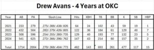 Those who watched the Dodgers vs A’s on Sunday got a chance to see such a player…29 year old OF Drew Avans. Drew reached AAA at the age of 25. However, instead of at least getting the call just once, he spent the next 4 years at OKC. At the end of the 2024 season, Drew was granted free agency and signed MiLB contract with the A’s.
