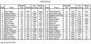 The list includes 3 players who have not yet made their professional debuts. Two players were 2024 draft picks, SS Kellon Lindsey (#8) and 3B Chase Harlan (#20). The third player who has not yet started his professional career is OF Mike Sirota (#21), who they acquired from Cincinnati in the Gavin Lux trade.