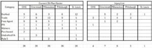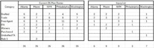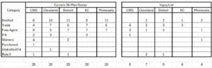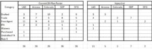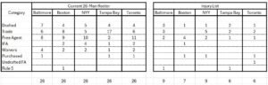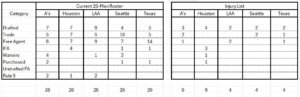 The data I used was compiled the day after the domestic opening day occurred. So what I report today has undoubtedly changed. Rosters are very fluid for all teams. My charts below reflect the different categories teams used to build their 26 man roster, plus those on the IL at the time.