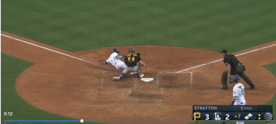 Look where Hayes’ foot was. Again I do not believe there was obstruction, but the Dodger runners need to push the envelope themselves. I guess I am tired of bases being blocked against the Dodgers, but the Dodgers not retaliating by running over the fielder or blocking the base themselves.