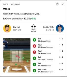 This is the playoffs. The Dodgers need to look to driving in runs. Critical moment in the 3rd inning of Game 2. Runners on 1st and 2nd, nobody out and Will Smith coming to the plate. Yes, Smith walked, but he fouled off an absolute center/center 83.5 MPH sweeper, and then fouled off an almost center/center 94.4 MPH 2-seamer on the next pitch. San Diego seemingly did not miss LAD pitcher mistakes.