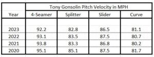 In 2022, in Gonsolin’s first 16 GS, he had 9 quality starts (QS), compared to his 3 in 2023 (11 GS).  Up to his July 7, 2022 start, Gonsolin had a 1.62 ERA, and a .157 BAA.  He allowed 6 HRs for April thru June.  He allowed 5 in July.  In his two starts following the All Star break, Gonsolin pitched 11.0 innings, allowing 7 runs (all earned) on 11 hits.  He seemed to be getting it back in August 2022 with 2 more QS, but his first start in September basically ended his season.  In his one playoff appearance, he was a ghost of himself against San Diego.