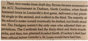 According to Moura, the Dodgers became enamored with Smith late in the pre-draft process, and were able to zero in and select him with the 32nd pick of the Compensatory First Round only because the Cardinals, who lost Lackey to the Cubbies, filed their transaction after Greinke’s move to the desert, leaving them with Pick No. 33.
