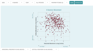 You can get the same chart for sinkers, changeups, curves, cutter, sliders, and splitters. You can manipulate the chart for horizontal and vertical movement. Below the chart is a list of the all pitchers who throw a 4-seamer, ranked with the best movement on their 4-seamer. Per this list, Matt Bush (Texas) has the most vertical movement, and Hoby Milner (Brewers) has the most horizontal movement. How that movement translates into outs probably requires even more algorithms.