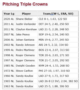 Today, with the limited number of IP by starters, I readily acknowledge that W-L stats are not meaningful (except to the pitcher). It used to be W-L, ERA, and strikeouts were the go to stats for pitchers. Thus, the Triple Crown for pitchers. Since 1945, 14 different years a pitcher earned a Triple Crown. Sandy Koufax three times and Roger Clemens twice. All other were one time recipients.