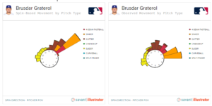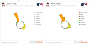 Maybe to better illustrate here are actual spin movements and observed spin movements for both Graterol and Hader. It becomes much more apparent as to why Hader’s whiff% and K% is so much better than Graterol’s.