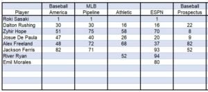 Below is the site where all of the prospect lists can be found. Some may be behind a paywall (probably Athletic). I apologize if some of you cannot access the publications list. If you have any questions, I will try to answer.