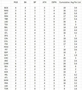 If you add up all of the top 100 prospects cumulatively by team, the Dodgers and Seattle had a total of 30 cumulative names for an average of 6 per list. CWS and Detroit had a total of 29 names, while Tampa Bay had 27. I know that is not very scientific, but I am going with it anyways.