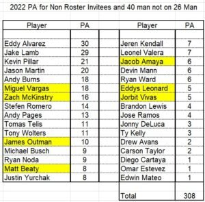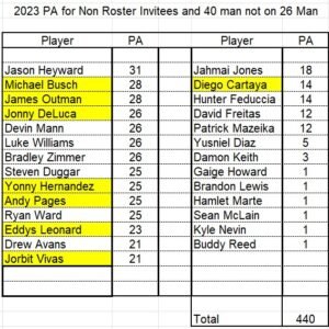 You will note that in 18 games for 2022, there were 308 PA’s for the non 26 man roster, while there have been 440 PA’s thus far in 2023 for the non 26 man roster players. Who are the players that have benefited the most?