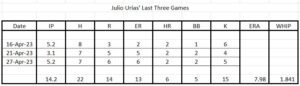 As indicated, Julio Urías has had three consecutive poor starts. On April 10, 2023, after 3 starts, Urías accumulated 18.0 IP, with an ERA of 1.50, a WHIP of 0.83, 20 K, 2 BB, and 1 HR. He was looking very much like an Ace.
