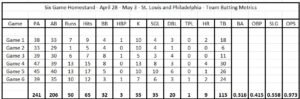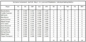 Below are tables of the Team and Individual Batting Metrics for the 6-Game Homestand.
