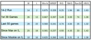 Outside of the 14-2 run, the HR/game have been very consistent. What isn’t consistent is hitting WRISP. Take a look at the team stats and they are at the very top of most of the offensive metrics. There is no question that this team has the capability of hitting. It is the timing of the hitting that is inconsistent.