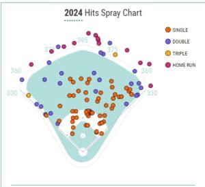 The team, more importantly RVS, needs to watch Freddie with 2 strikes and the game on the line. No overswing with a launch angle designed to hit the ball 450 feet, when simply a single will do. Freddie has done that twice in the last 4 games. There are those out there that think Freddie listens to RVS. No he doesn’t. He has not changed his approach since he came over from Atlanta. He is still a line drive hitter who sprays the field, mostly up the middle and gap to gap. Check out Freddie’s 2024 Hit Spray Chart below: