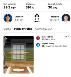 That play in the 4th by Miggy Ro on Brice Turang was eye-popping. Turang was safe, but the effort was exceptional. There is only a handful of batters who are safe on that play. I agree with Sam Oyed that the Turang infield single seemed to unnerve Glasnow. It was that one inning. His 5th and 6th innings were just as dominant as the first three innings. His velo was slightly up over his 2024 average, so I do not think he was running out of gas. He allowed 6 hard hit balls, and only 2 > 100 MPH. Hoskins HR was 99.3 MPH.