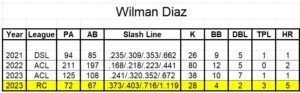 After his 2022 season at Rookie League in the Arizona Complex League, Diaz dropped out of the Top 30 prospects. That was reflected in the FanGraphs Scouting Report in 2023.