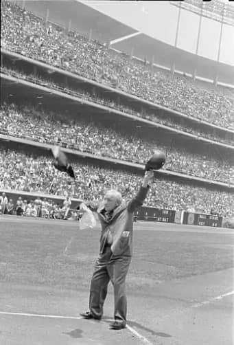 They don’t make them like this anymore, Casey Stengel re-enacting releasing a bird from under his hat at Dodger Stadium as he manages a team at Oldtimers day. Notice the auxiliary scoreboards along the fence.